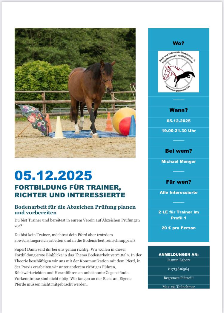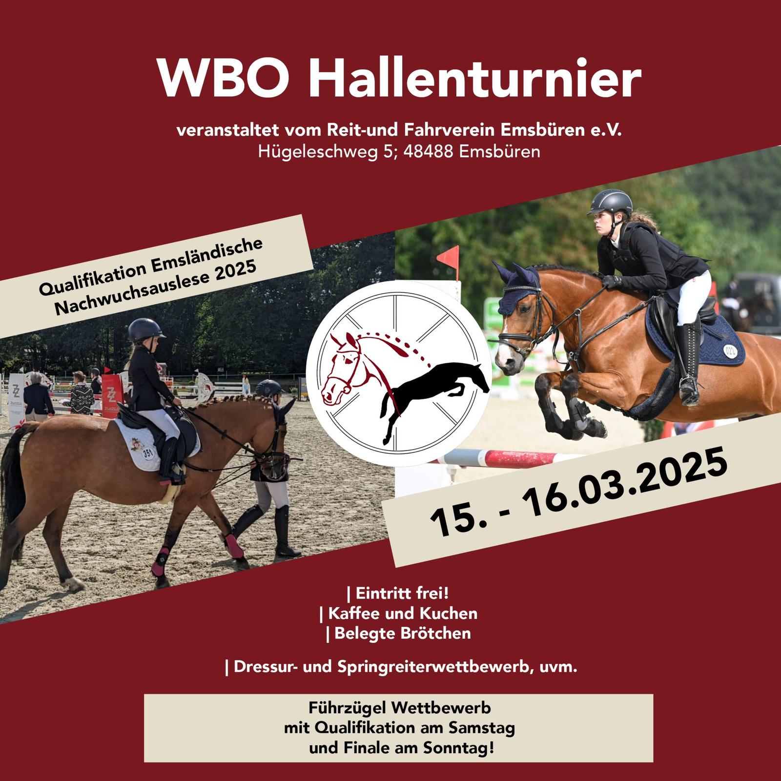 Vom 15.03.2025 bis 16.03.2025 findet unser diesjähriges Märzturnier in unseren Hallen statt. Es werden vor allem Prüfungen für die Anfänger sowie kleinere Dressuren und Springen angeboten.