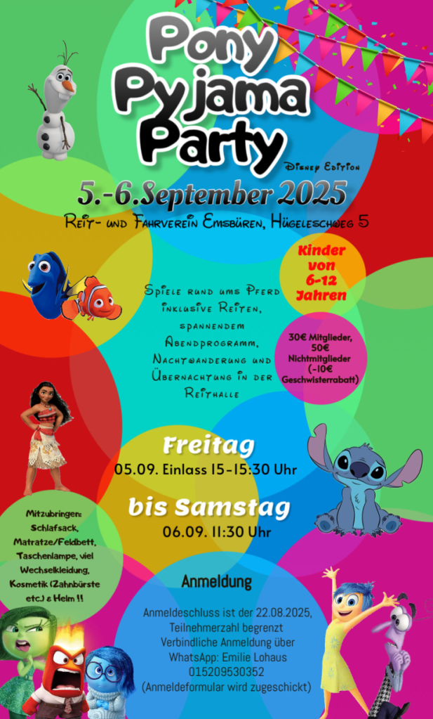Vom 05.09.2025 bis 06.09.2025 findet unsere diesjährige Pony Pyjama Party in der Disney Edition statt. Dabei können sich die Kinder auf viele Spiele und Aktionen freuen, sowie einer Nachtwanderung mit anschließender Übernachtung in der Reithalle.