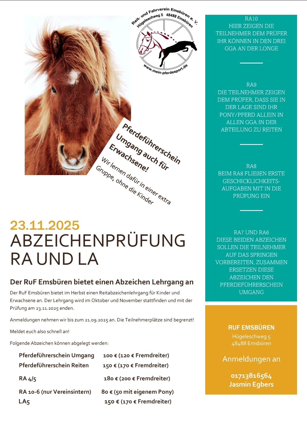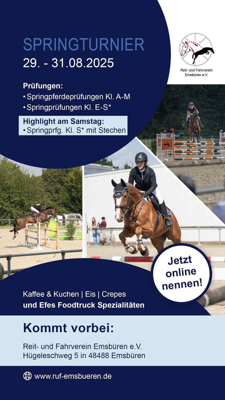 Vom 29.08.2025 bis 31.08.2025 findet unser diesjähriges Springtunier auf unserem Vereinsgelände statt. Es werden Prüfungen für die Anfänger und Springen bis Klasse S angeboten. An den drei Tagen gibt es wie auf jedem unserer Turniere eine Auswahl an Getränken sowie verschiedenste Essensangebote.