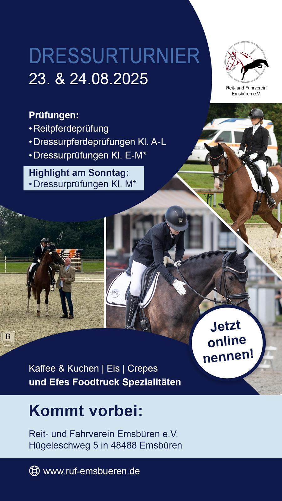 Vom 23.08.2025 bis 24.08.2025 findet unser diesjähriges Dressurturnier auf unserem Vereinsgelände statt. Es werden Dressurprüfungen bis Klasse M angeboten. An den zwei Tagen gibt es wie auf jedem unserer Turniere eine Auswahl an Getränken sowie verschiedenste Essensangebote.